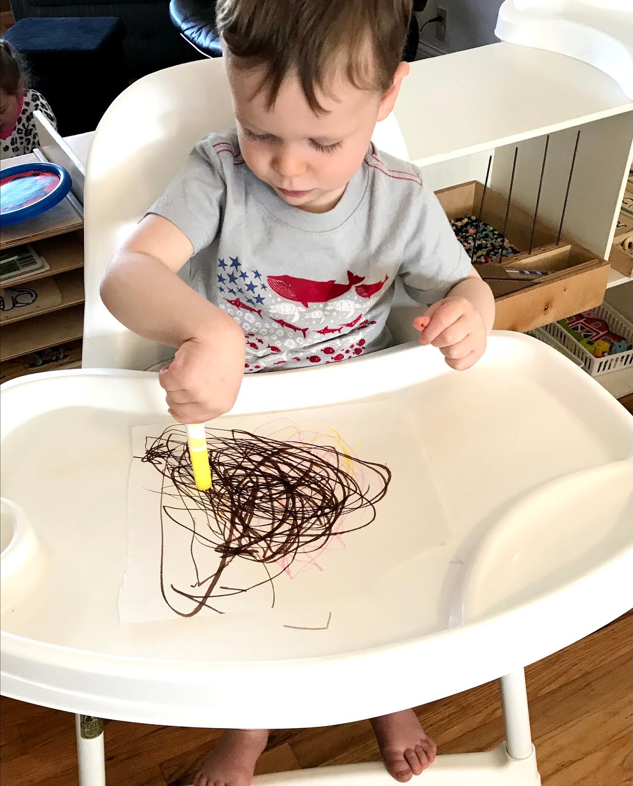 Last picture: Cal wanted to do some coloring and then he did some stickers as well; with my assistance. So he's learned a new skill and that's what he's doing in the picture. Putting the cap back on the marker before moving on to another marker. The nice thing about the markers is they "snap" into place when they are closed and the kids feel successful. Good job Cal!!