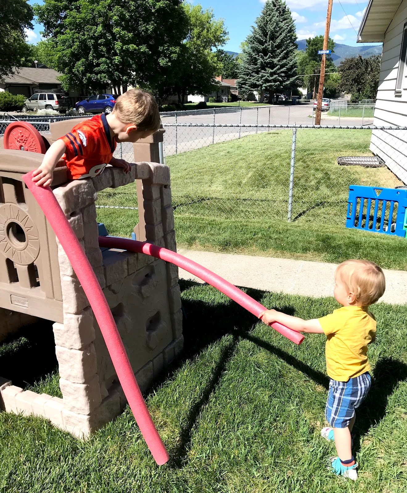 Next picture; We were outside waiting for Nora, Avi, and Svea to return from swim lessons. The boys were having fun with these "noodles." It's amazing how much enjoyment the kids have had with these noodles from the Dollar Store!! In the following picture they were both on the climber and Cal said, "I'm driving and I'm going to see Nora and Sophie!!" :) I wanna go too!!