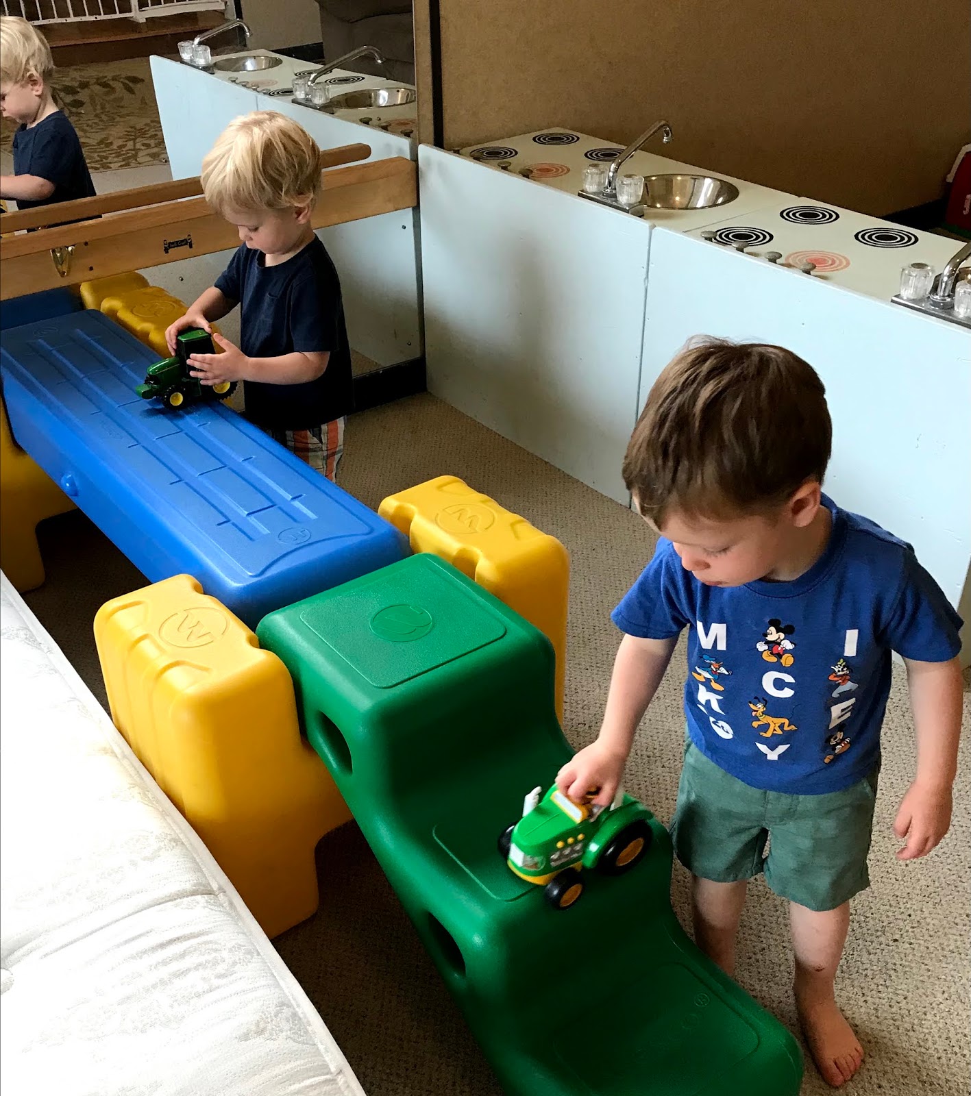 More pictures of the boys playing in close proximity this morning. The second picture - the boys were dinking around laughing at the cool air coming out of the vent. Thank goodness the air cooler has been fixed and life is good again!! :)